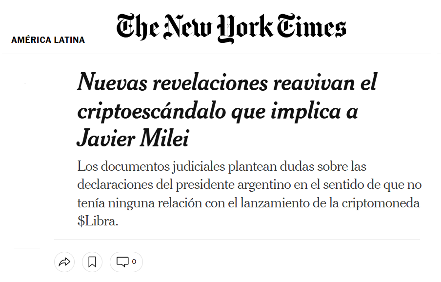 Las revelaciones publicadas por The New York Times sobre el caso $Libra volvieron a encender alarmas en torno a Javier Milei y su presunta relación con la criptomoneda que colapsó tras ser promocionada por él. Con pruebas que contradicen su versión pública y una investigación en curso, el episodio ya no es solo un problema local: si el caso escala a tribunales internacionales, como sugieren análisis derivados del propio informe, el presidente podría enfrentar un escenario judicial mucho más complejo que el que hoy parece contener en Argentina.